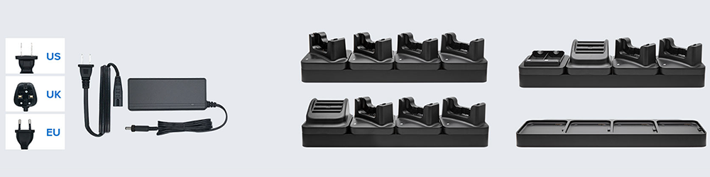 The above two Single Charging Cradles need to use together with the power supply 8E00-00040110/ 8E00-00040120/ 8E00-00040130/ 8E00-00040140 US/EU/UK/Chinese DC power supply